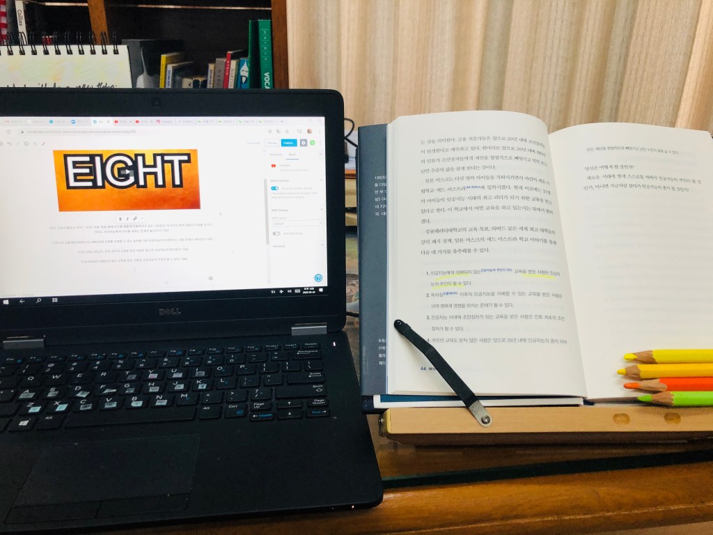 에이트에서 이지성 작가는 창의성과 공감능력이 필요한 새로운 교육 시스템의 도래가 필요하다고 필역한다. “2090년의 한국사회는 인공지능 로봇이 대부분의 직업을 대체한 결과 한국인의 99.9997%가 프레카리아트가 된다고 말이다” (140). 인공지능에게 지배당하는 계급이 되지 않으려면 스스로 혁명하고 창의성과 공감능력이 있는 21세기 새로운 인간의 고유 능력을 개발해야 한다고 필역한다. 이미 일본은 2003년 국제 바칼로리아 IB로 전역하였고 창의성과 공감력을 개발하도록 유도 하는 책 사유와 나눔 중심의 교육을 진행하고 있다 (220). “UN이 발표한 바에 따르면 우리나라는 국민 평균 독서량이 세계 166위다” (53). 그러므로 책을 독려하는 교육 김병완 컬러지 등 우기부기 TV와 같은 책읽기를 독려하는 매체와 무브먼트가 더 필요하다는 것이 필자의 생각이다. 또한 Ted에서도 강연했던 교육학자 Sir Ken Robinson이 주장해왔던 창의성의 중요성이 올해 William and Mary 한국 교수님이 한국에 오셔 강연을 하셨듯 이제는 창의성은 필요성을 넘어 필수성을 갖고 있다해도 과언이 아닐 것 같다. 또한 미얀마에서 고등학교때 국제학교에서 IB의 고유의 시스템의 유익을 철저하게 받은 한 사람으로서 IB와 같은 창의성과 공감력을 키워줄 수 있는 교육 시스템이 한국 및 많은 나라에 도입되었으면 하는 필자의 바램이다. 또한 얼마전 이어령 전 교육 장관께서 인터뷰에서 말씀하셨듯 AI가 도래한다면 공감능력을 가진 AI를 다스릴 수 있는 인재상이 새로 정립되어야 한다는 주장 또한 필자는 동의한다. Teach-Now라고 하는 국제학교 선생님이 되기 위하여 공부하게 된 내용을 공부하며 AI가 도래하며 더 이상 선생님의 역할이 현재의 역할에 국한 되어서는 안되며 변하는 세상에 적응 하기 위해 선생님의 역할이 재정립 되어야 하다는 마이크소프트의 리포드를 읽은 경험이 있다. 실제적으로 에이트에서는 현재 세계에서 진행죽인 “인공지능 교사 프로젝트”를 나열하고 있으며 많은 인공지능 교사들이 현재 교사들을 지식적인 부분은 고사하고 정서적인 부분들까지도 무의식적인 편애나 차별없이, 또한 자존감을 상하게 하는 말이나 언행없이, 답답해하거나 귀찮아하는 내색 없이 너무나 친절하고 상냥하게 반복하여 같은 내용을 설명하므로 학생들에게 많은 인기를 얻고 있다는 것이 연구의 결과다. 심지어 장애가 있는 학생들에게 더욱더 필요한 치료 교육을 더욱더 효과적으로 제공한다는것이 또한 인공지능 교사 프로젝트의 연구 결과다. 정서적인 부분과 교감이 필수인 선생님들의 역할을 고려했을때 인공지능이 대체할 수 없는 역할이라고 많은 사람들이 생각해 왔음에도 불구하고 그 예상을 뒤엎고 이렇게 인공지능의 탁월함을 보여주고 있는 상황 가운데서 선생님들의 역할의 기대와 기준은 점점 높아져만 간다.