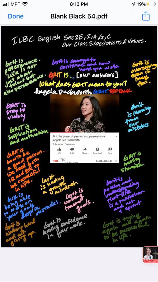 | Students will be annotating the video while watching Angela Duckworth’s Tedtalk on GRIT | We will come up with a group work of GRIT wall where we will compile every one’s ideas on the notion of GRIT and set it up as set of class expectations and norms for class. |